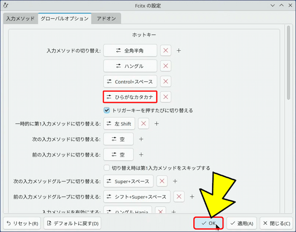 これで、「カタカナ/ひらがな/ローマ字」キーを押すことで日本語入力の切替が可能になる。