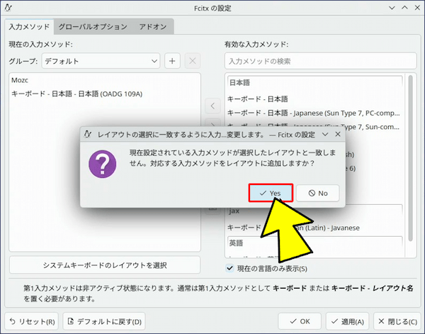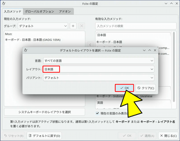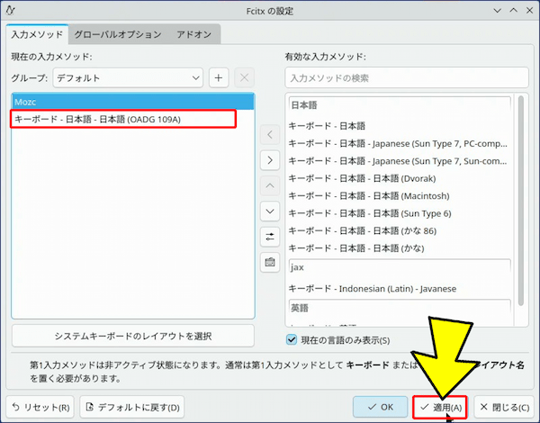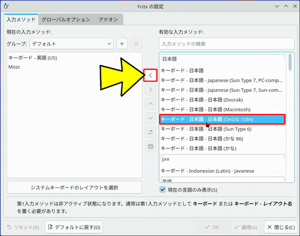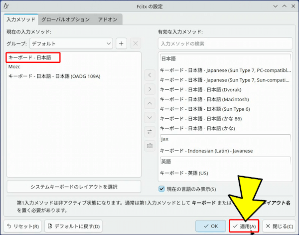🧰 重要:「Fcitx の設定」で、「入力メソッド」に日本語キーボードを追加する。