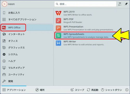 タスクマネージャーにある「Discover ソフトウェアセンター」を開き、検索バーで「wps office」を検索すると、【Flatpak】版と【Snap】版が表示される。(KDE neonでWPS Officeをインストールする場合、一般的にはFlatpak版が推奨されている。)