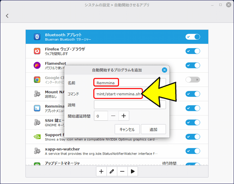 「自動開始させるアプリ」に Remmina が追加される。