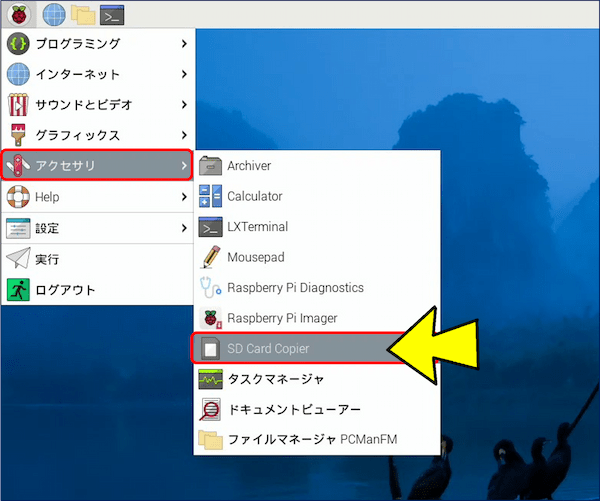 「アクセサリ」にある「SD Card Copier」で、クローンを作成しておく。
