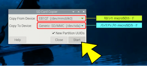 Copy From Device(コピー元)に【/dev/mmcblk0】を選択し、Copy To Device(コピー先)に【/dev/sda】を選択して、且つ、「New Partition UUIDs」にチェックを入れて「Start」をクリックする。