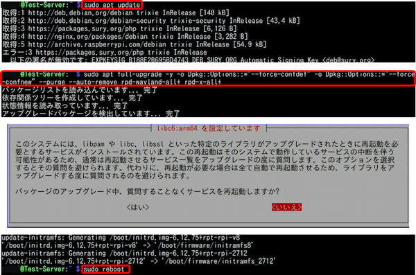 🔄 Raspberry Pi OS Bookworm から Trixie(Debian 13)へのアップグレードは、パッケージリストの記述を bookworm から trixieに書き換え、【apt update】と【apt full-upgrade】を実行するだけで実施できる。
