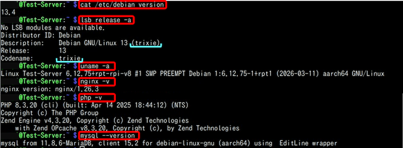 現在稼働している Webサーバーは、Raspberry Pi OS が 【Bookworm】 で、この上で稼働しているサーバーソフトは【nginx + php + WordPress】の構成になっている。このWebサーバーの環境を保持したまま、OSのみを Bookworm から Trixie にアップグレードし、問題なく稼働するかテストを試みた。
